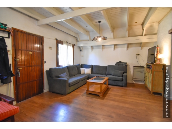 Cuenta con jardin al frente. Amplio living comedor con hogar 4,6x6, ventilación natural al frente. Pasillo de distribución 2,8x1. Ante-baño y baño completo 1,6x2,4. Cocina comedor con barra desayunadora 3,7x7,3, muy luminosa, ventilación natural al parque. Dormitorio chico/escritorio 2,8x3 con placard empotrado y ventilación natural al parque, a continuación acceso a la planta alta donde se encuentra el dormitorio principal 7,6x3 con placard empotrado. Lavadero. Amplio parque con arboles frutales y parrilla. Garage para un vehiculo 7x2,7. Entrada para varios vehiculos descubierta.