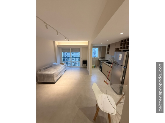 Living comedor con cocina semi integrada la cual cuenta con espacio para lavarropas, baño completo con mampara, habitación con placard empotrado.